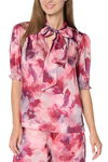 Susan Graver Women's Printed Satin Twill BowNeck ElbowSlv Blouse Berry